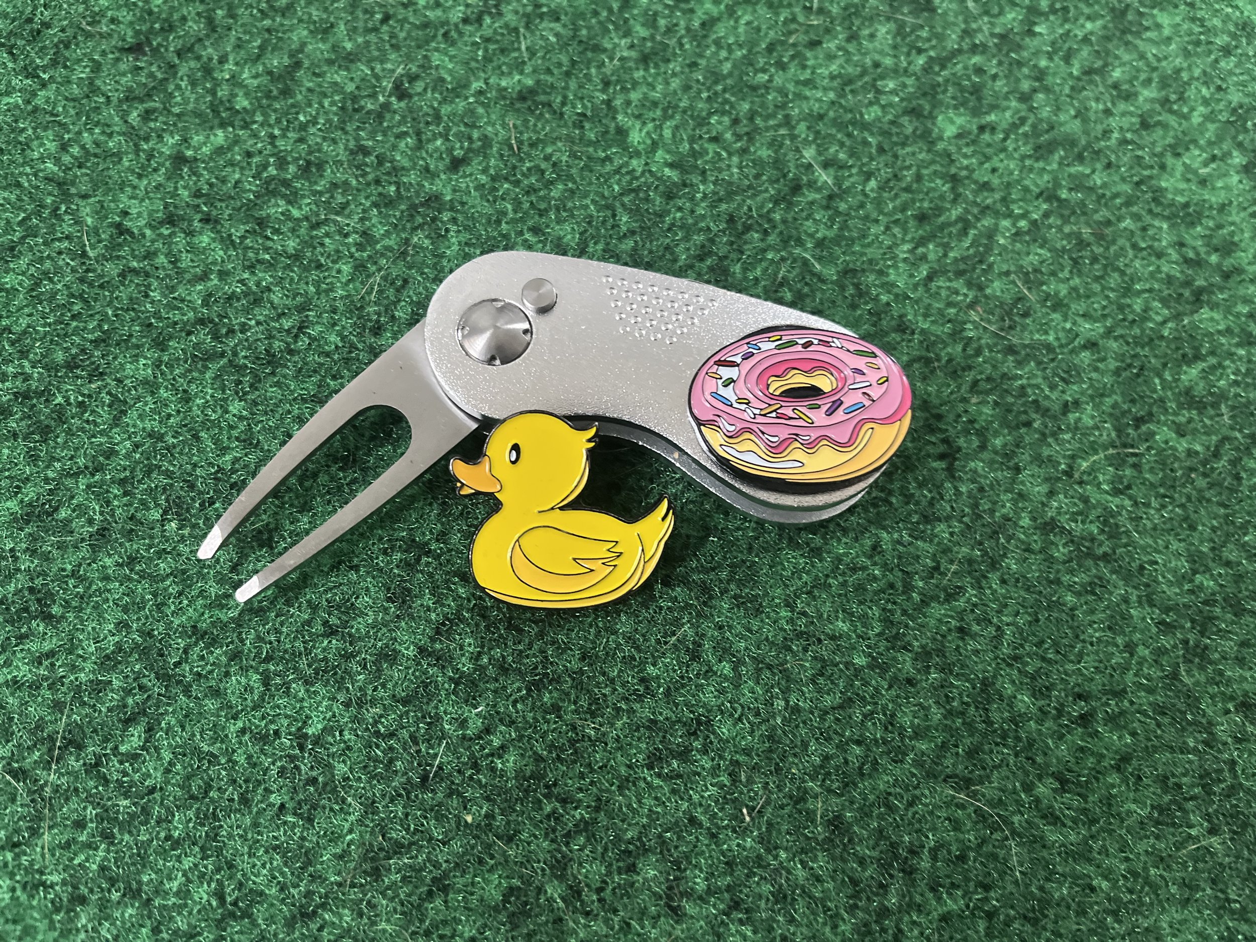 A Divot Tool is a small fork-like tool golfers use to fix ball marks on the putting green. Many come with magnetic Ball Markers in fun designs that snap onto the tool for easy use.